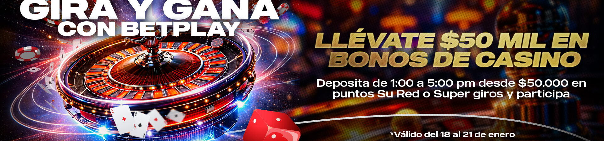 Participa en la actividad “R1124 Gira y Gana con BetPlay”, desde el Domingo 18 de enero de 2026 hasta el miércoles R1124 “Gira y Gana con BetPlay”Más informaciónCAMPAÑA CLIENTES